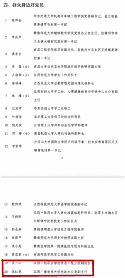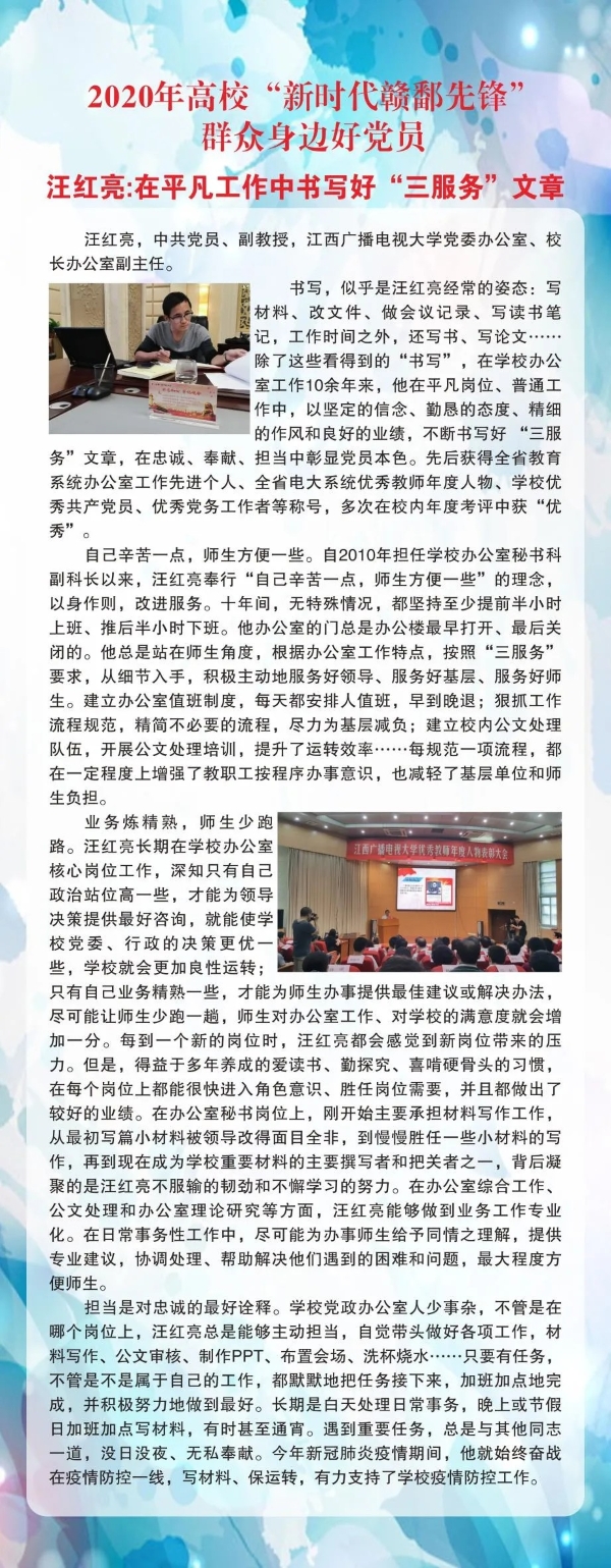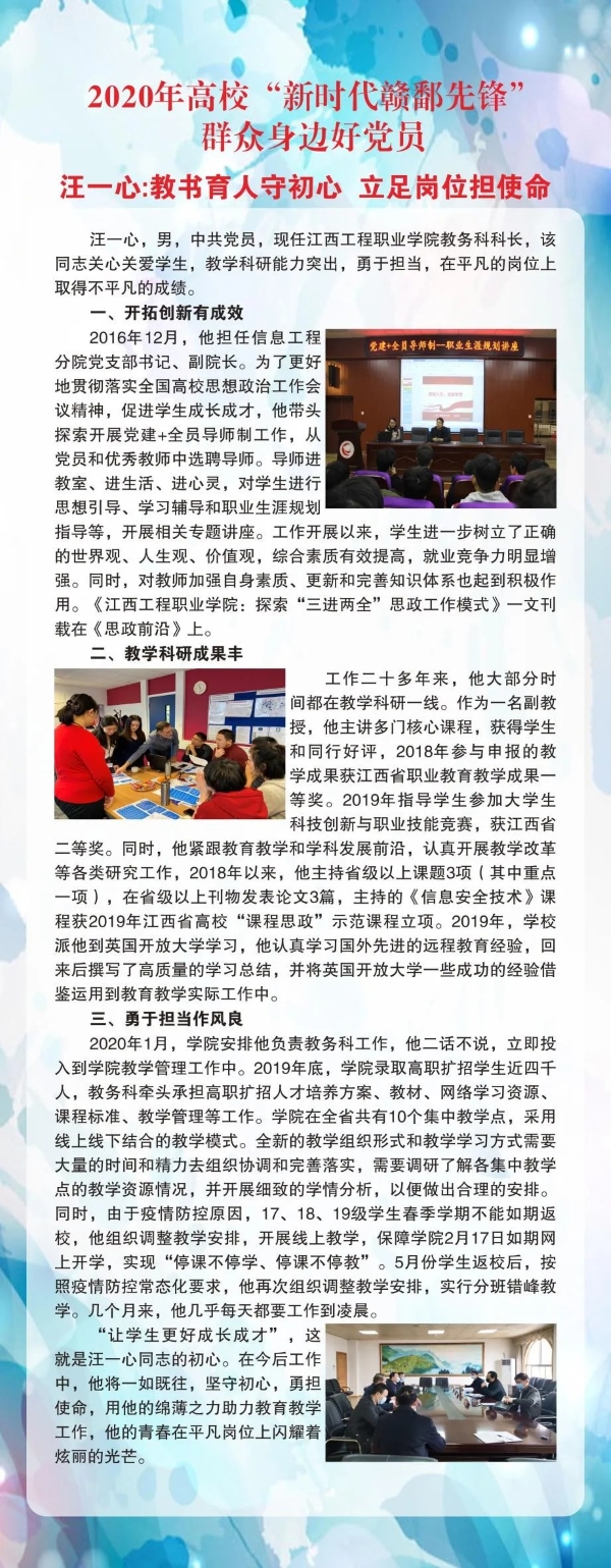 近日,江西省教育工委公布了江西省2020年高校“新时代赣鄱先锋”人员名单,威廉希尔官网高职学院信息工程分院副院长汪一心、党政办公室副主任汪红亮入选“群众身边好党员”。