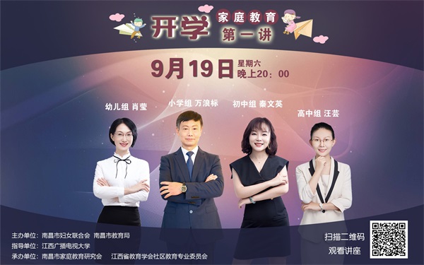 为贯彻习近平总书记关于家庭教育工作的重要指示,充分发挥家长在家庭教育中的重要作用,促进青少年身心健康成长,9月19日20点,由威廉希尔官网指导,南昌市教育局和南昌市妇联联袂主办的家庭教育“开学第一讲”正式线上开播,活动吸引了全市12.6万家长在线观看。本次在线课程直播活动由江西省教育学会社区教育专业委员会和南昌市家庭教育研究会承办,分幼儿园、小学、初中和高中四个学段,分别邀请了省内家庭教育知名专家肖莹、秦文英、汪芸和万浪标进行线上授课。