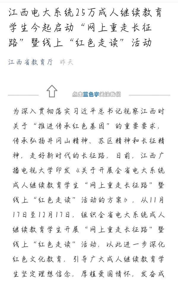 为深入贯彻落实习近平总书记视察江西时关于“推进传承红色基因”的重要要求,传承弘扬井冈山精神、苏区精神和长征精神,走好新时代的长征路,从11月17日至12月17日,江西广播电视大学组织全省电大系统成人继续教育学生开展“网上重走长征路”暨线上“红色走读”活动,以实际行动迎接建党100周年。活动的开展引发了各界关注。