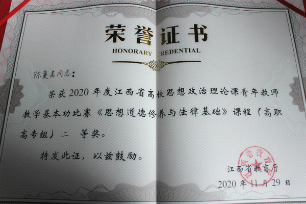 根据教育厅《关于公布2020年度全省高校思想政治理论课青年教师教学基本功比赛获奖名单的通知》,威廉希尔官网高职学院教师陈蔓茜于11月27日—29日在江西省教育厅举办、东华理工大学承办的2020年度全省高校思想政治理论课青年教师教学基本功比赛中荣获二等奖。