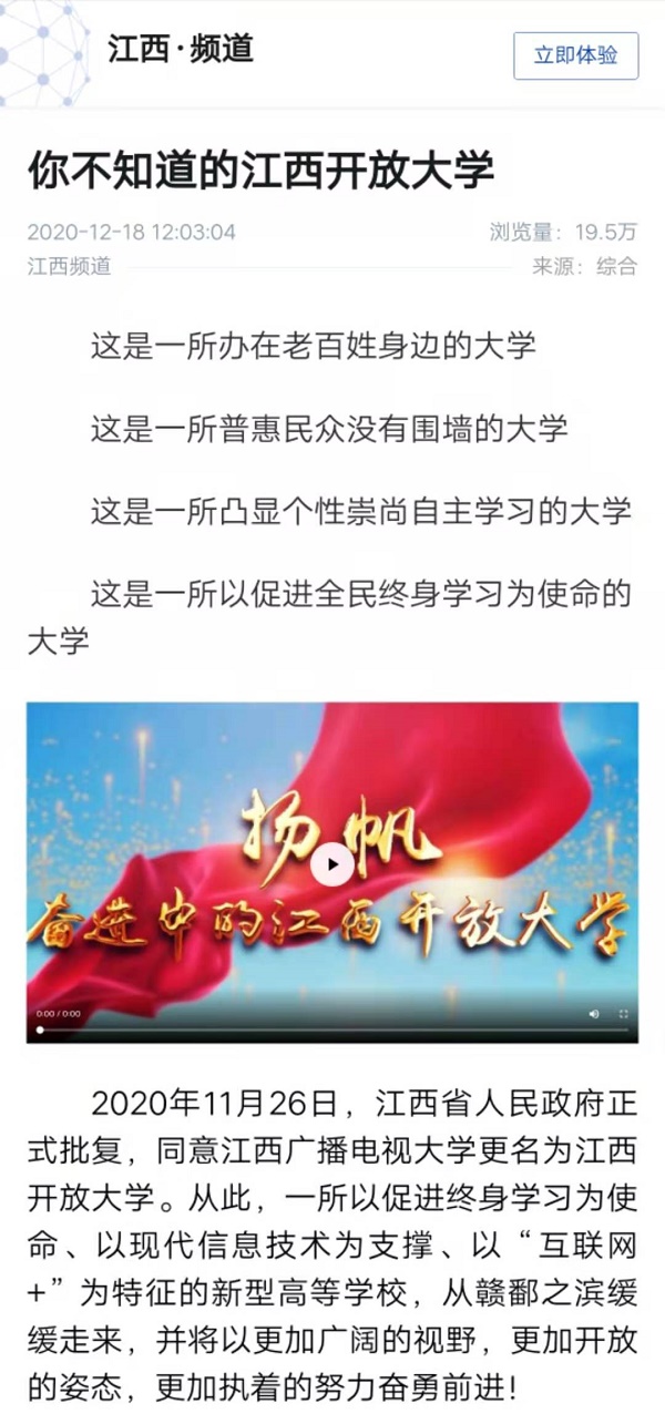 为迎接威廉希尔足球网更名,学校推出全新校情宣传片《扬帆——奋进中的威廉希尔足球网》。12月18日,新华社江西频道、江南都市报先后以《你不知道的威廉希尔足球网》为题,隆重推介了威廉希尔官网宣传片,发布后两小时,点击量已突破19万。