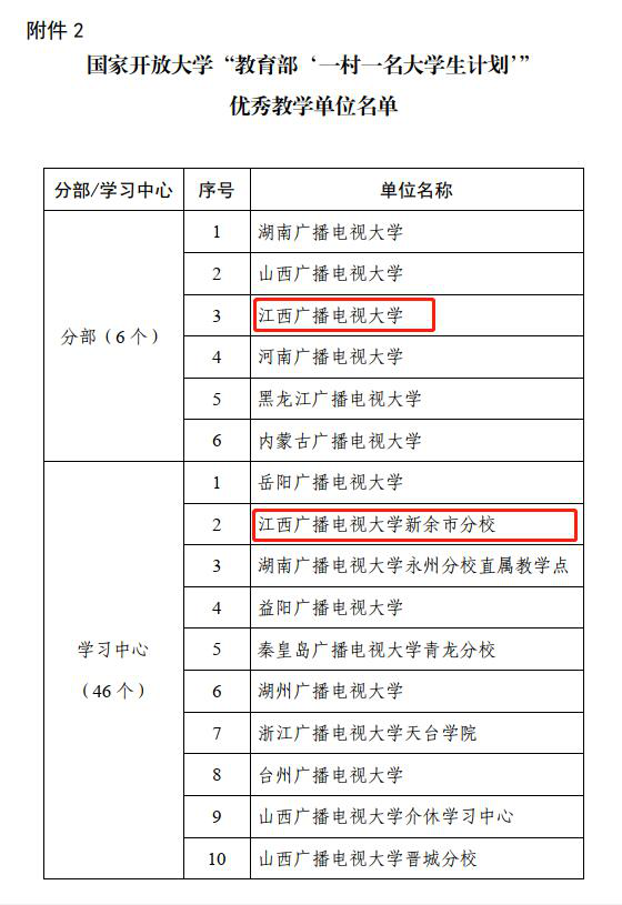 近日,国家开放大学公布了“教育部‘一村一名大学生计划’”优秀教学单位评选结果,威廉希尔官网及新余电大分校本部、景德镇市电大乐平市教师进修学校教学点、萍乡电大芦溪工作站、上饶电大上饶县工作站、抚州电大南丰县工作、吉安电大新干县委党校教学点被评为国家开放大学“教育部‘一村一名大学生计划’”优秀教学单位。