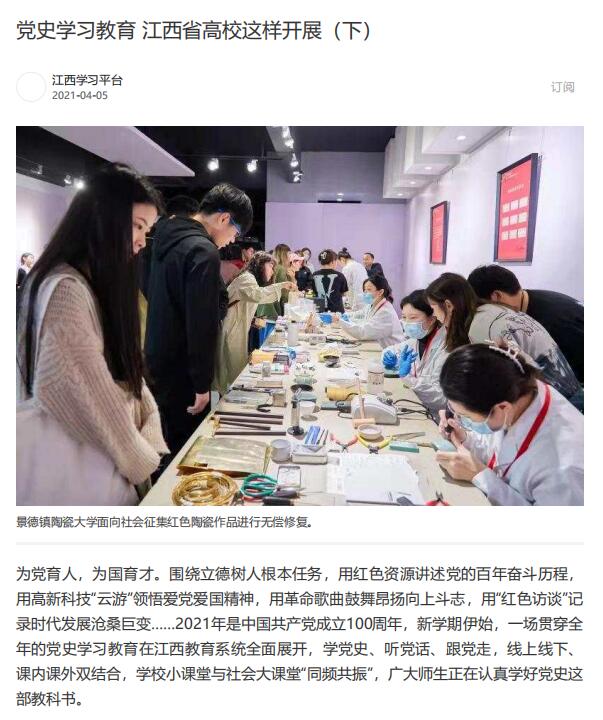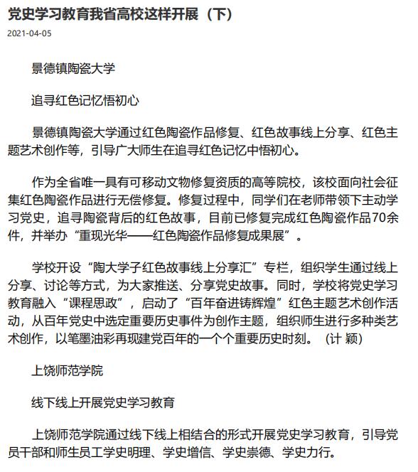 4月5日,江西日报、学习强国、江西新闻客户端等媒体以《党史学习教育 我省高校这样开展(下)》为题,报道江西省各大高校党史学习教育情况,威廉希尔官网《开展“红色之旅接力行”学党史》收录其中。