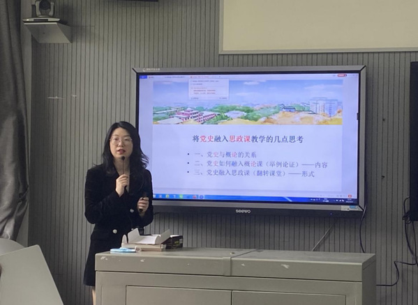 工程职院思政课教师陈蔓茜从党史与毛泽东思想和中国特色社会主义理论体系概论的关系、党史如何融入概论课以及党史融入思政课三个方面层层深入的阐述了自己将党史融入思政课教学的几点思考。她还分享了自己讲授思政课的体会,表示如今的学生都有着强烈的爱国情怀,作为思政老师,更要好好引导。