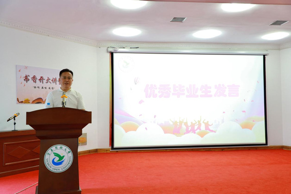 优秀毕业生王会占代表毕业生发言,他感谢党和国家的政策,深情告白母校,并满怀真诚地回顾了三年求学时光,向学校及辛勤工作、无私奉献的老师们致以深深谢意。
