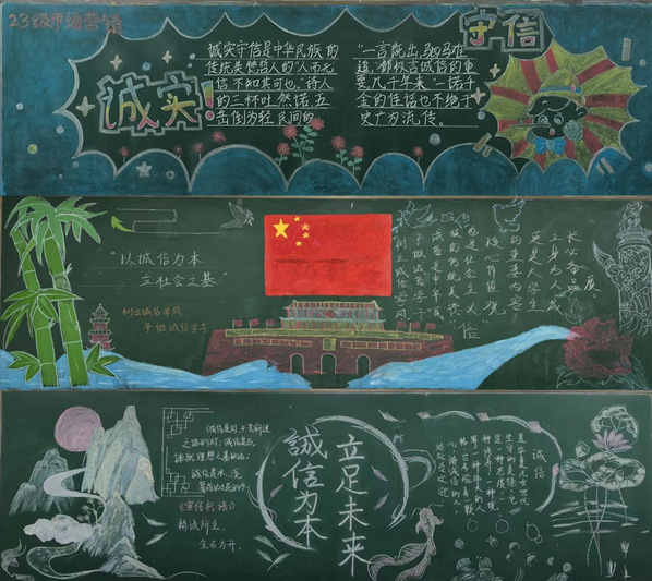 在黑板报评比活动中,同学们充分发挥自己的创造力和想象力,以“诚信”为主题,围绕诚信的内涵、价值、意义,通过精心设计的版面、生动形象的插图和深刻独到的文字,传递诚信的力量和温度,在潜移默化中感受诚信的魅力。经过专业学院初选、学生工作处终评,9幅作品脱颖而出。
