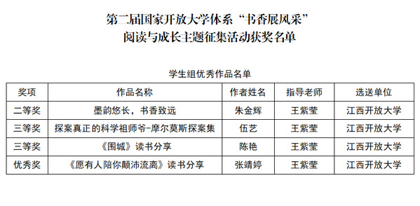 此次活动充分调动了广大师生的阅读和学习热情,丰富了全省开大师生的精神文化生活。学校将继续开展更加丰富多样的读书活动,持续推动阅读文化的传播与推广,为师生提供更加丰富和多元的阅读资源和平台,为建设学习型社会、学习型大国贡献开大力量。(供稿:学习资源中心(图书馆) 编辑:梅莲 责编:黄莎)