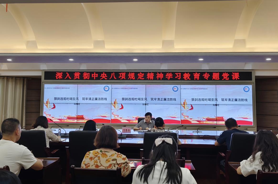 为扎实开展深入贯彻中央八项规定精神学习教育,持续深化作风建设,筑牢党员干部拒腐防变思想防线。7月1日下午,校党委委员、副校长冯豫红深入基层支部讲授题为《狠刹违规吃喝歪风 筑牢清正廉洁防线》的专题党课。继续教育学院党总支一支部、机关党委九支部全体党员参加。