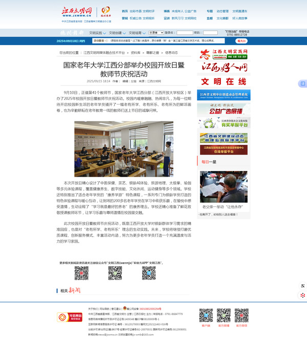 9月10日,正值第41个教师节,国家老年大学江西分部(威廉希尔足球网校区)举办了2025年校园开放日暨教师节庆祝活动。校园内暖意融融、热闹非凡,为每一位期待开启校园新生活的老年学员铺开了一幅老有所学、老有所乐、老有所为的鲜活画卷,也为辛勤耕耘在老年教育一线的教师们送上节日的诚挚问候。