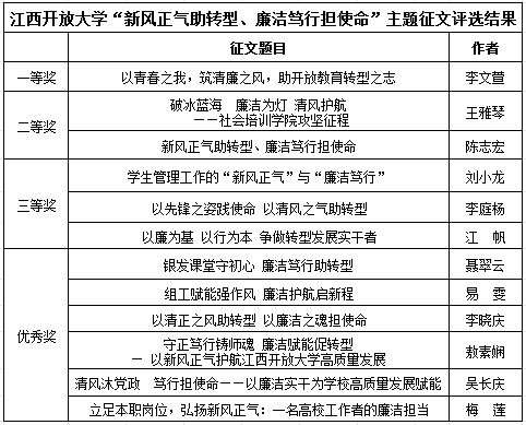 近日,由校纪委主办、理工与农医学院承办的“新风正气助转型、廉洁笃行担使命”主题征文活动圆满结束。在广大教师的热情参与下,共有19篇作品提交评审。经过专家评审,共评选出一等奖1篇、二等奖2篇、三等奖3篇、优秀奖6篇。获奖作品主题突出、内容深刻、文笔流畅,彰显了威廉希尔官网教师对廉洁从教的深刻认识、对学校转型发展的使命担当。