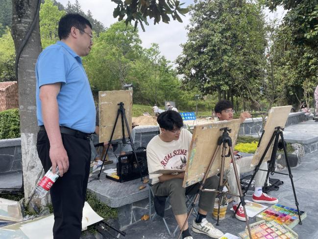 梅甜甜与同学们做亲切交流并观摩点评了学生的作品,对学生亲近自然,用画笔采集大自然瑰丽的色彩、描绘徽州青山绿水掩映下的白墙灰瓦的写生活动,给予了充分的肯定与鼓励。梅甜甜勉励同学们要珍惜实地写生学习机会,多创作出好的作品,为将来走向社会、实现自己的人生价值奠定基础。