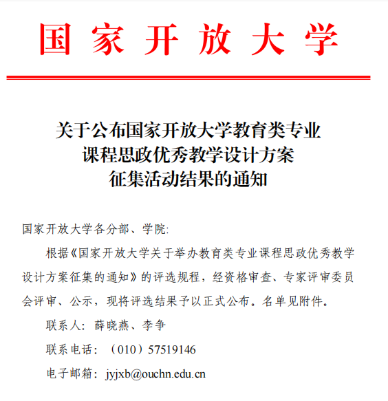 喜报: 陈海燕等6位教师在国家开放大学教育类专业课程思政优秀教学设计方案征集活动中荣获佳绩