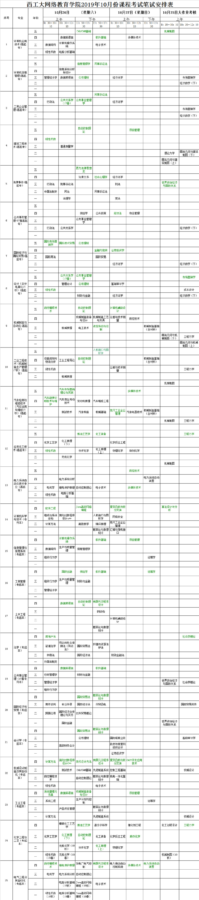 西工大网络教育学院2019年10月份课程考试笔试安排表